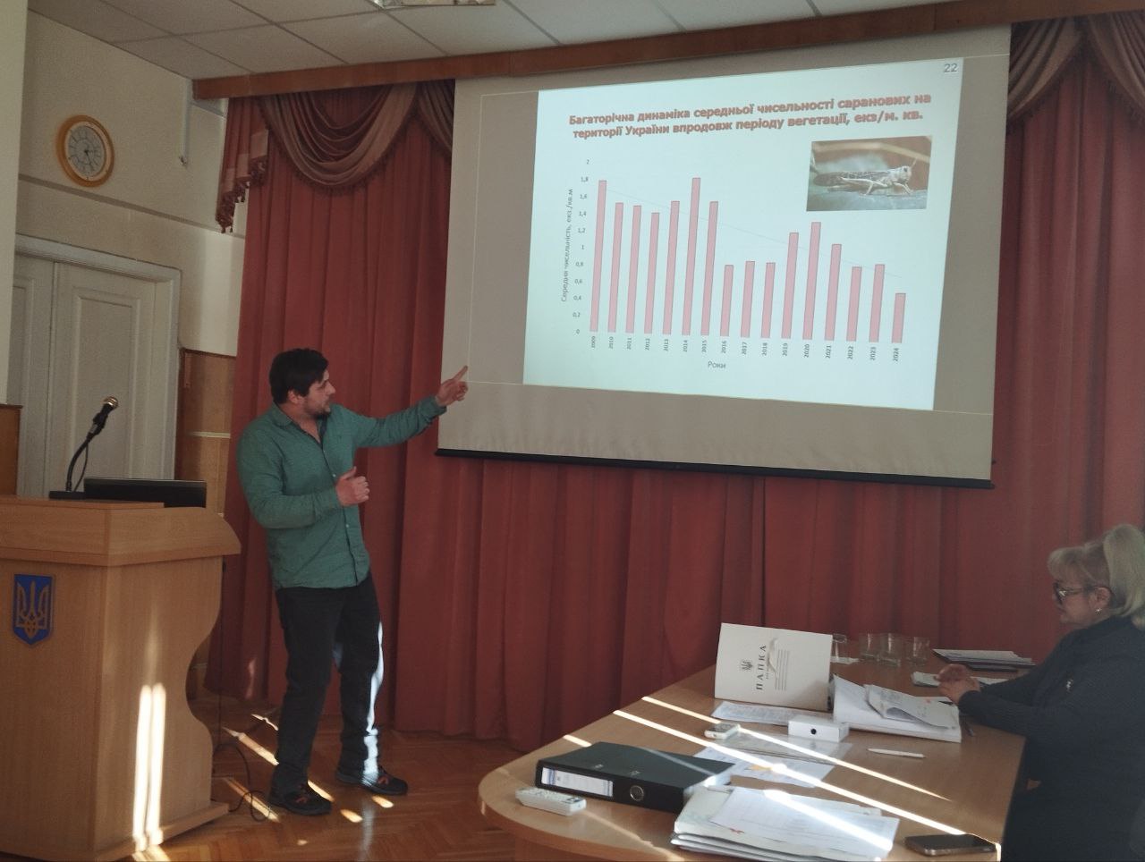 Саранові (нестадні види): на неорних землях, у лісосмугах, на багаторічних травах на 10-16 % площ зустрічаються окрилені особини в кількості 0,5-3,0 екз./м2, пошкоджено 2-3 % рослин (Одеська, Полтавська обл.).